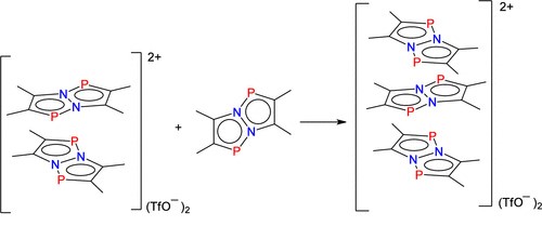 Сотрудники ИМХ РАН установили, что в результате реакции DDP с его дихлоридом и триметилсилил трифлатом происходит образование двухпалубных дикатионов диазадифосфапенталена [(DDP)2]2+(TfO–)2, которые могут выступать в качестве π-акцепторов при взаимодействии с плоскими молекулами π-доноров. Дальнейшее присоединение еще одного эквивалента DDP позволило получить глубоко окрашенные трехпалубные соединения [(DDP)3]2+(TfO–)2.