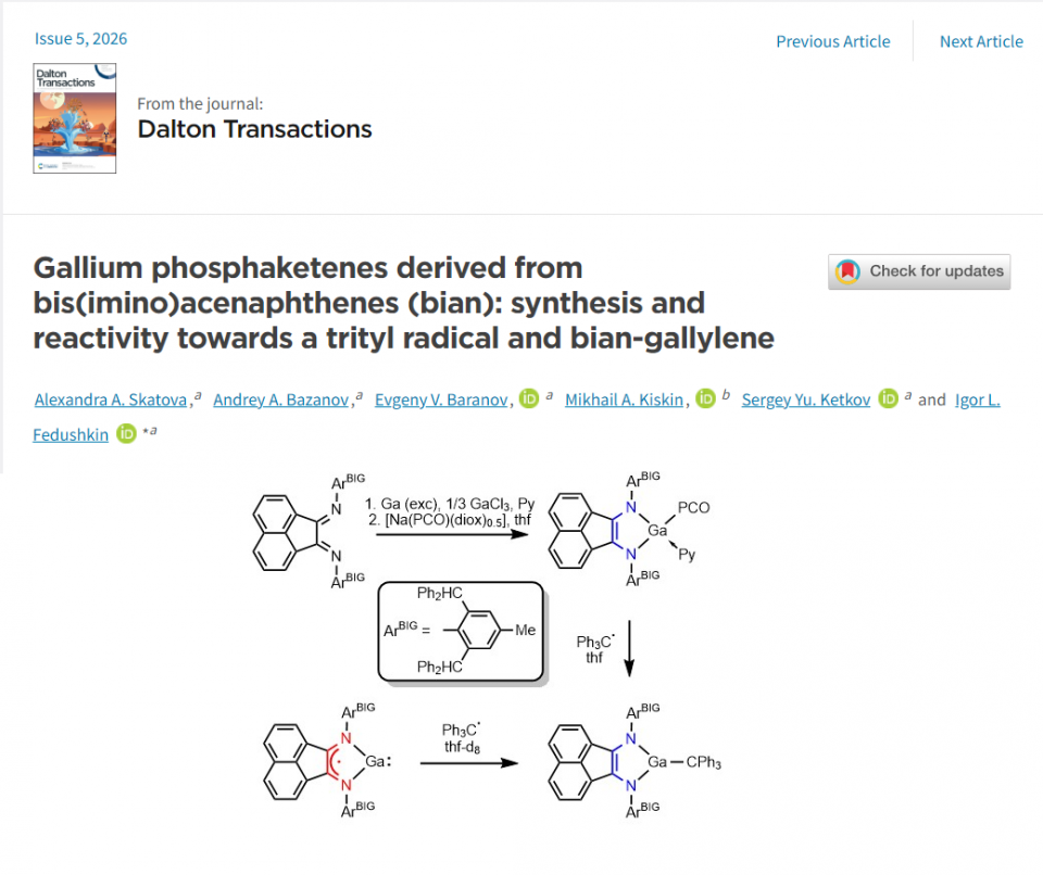 Статья сотрудников ИМХ РАН Gallium phosphaketenes derived from bis(imino)acenaphthenes (bian): synthesis and reactivity towards a trityl radical and bian-gallylene попала в подборку Hot atricles журнала Dalton Transactions.